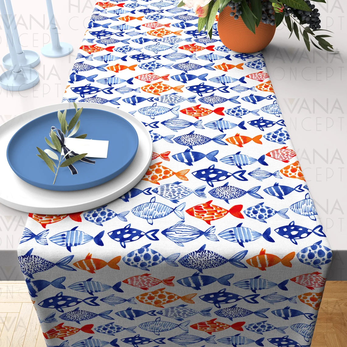 Handgezeichneter Tischläufer mit Aquarellfischen