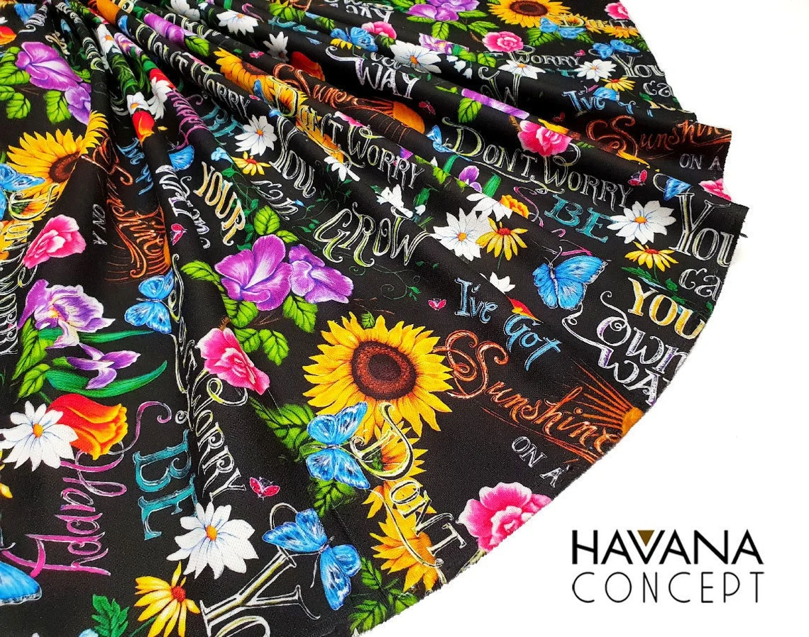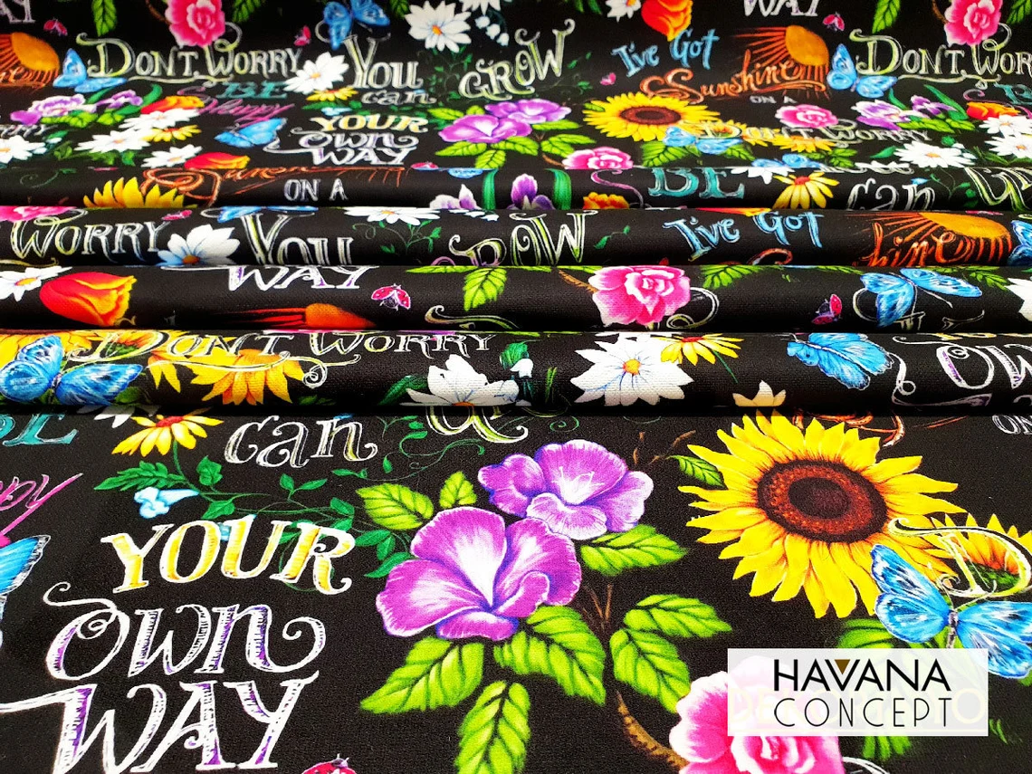 Woodstock Hippie Blumenstoff by the Yard – Dont Worry be Happy Text on Black Print Fabric for Home Decor – Chair, Sofa Upholstery Fabric