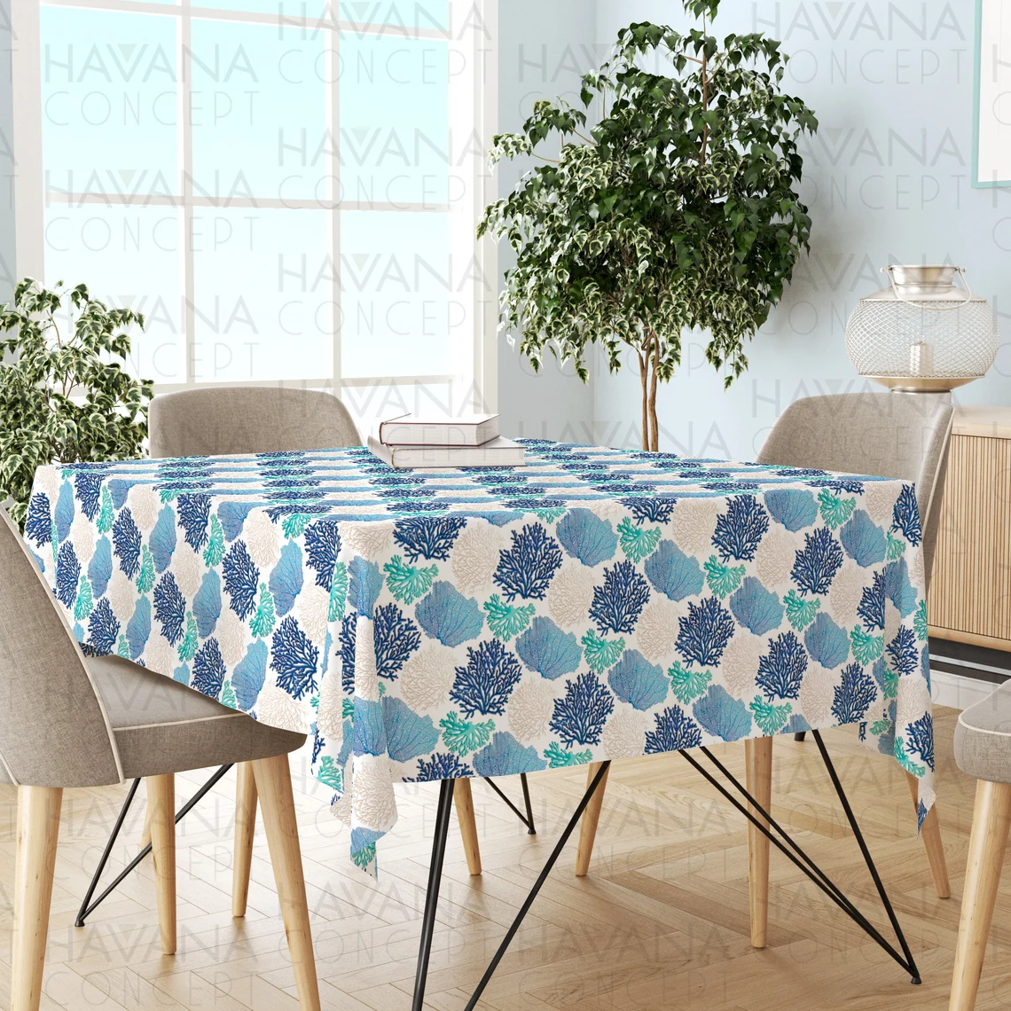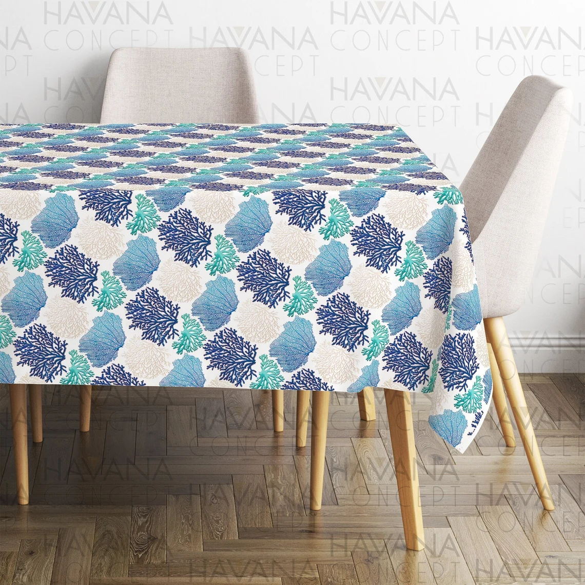 Nautical Tablecloth – Table Centerpiece Blue Tablecloth, Coral Reefs on White Table Linen, Coastal Home Decor Tablecloth, Beach House Decor
