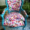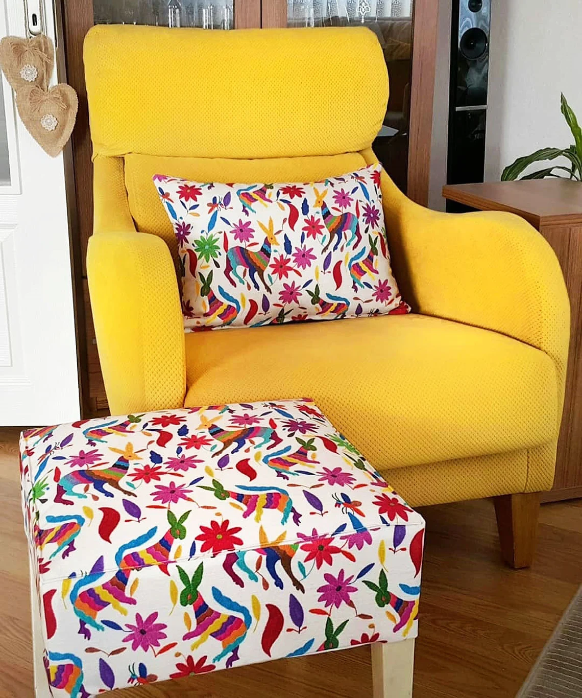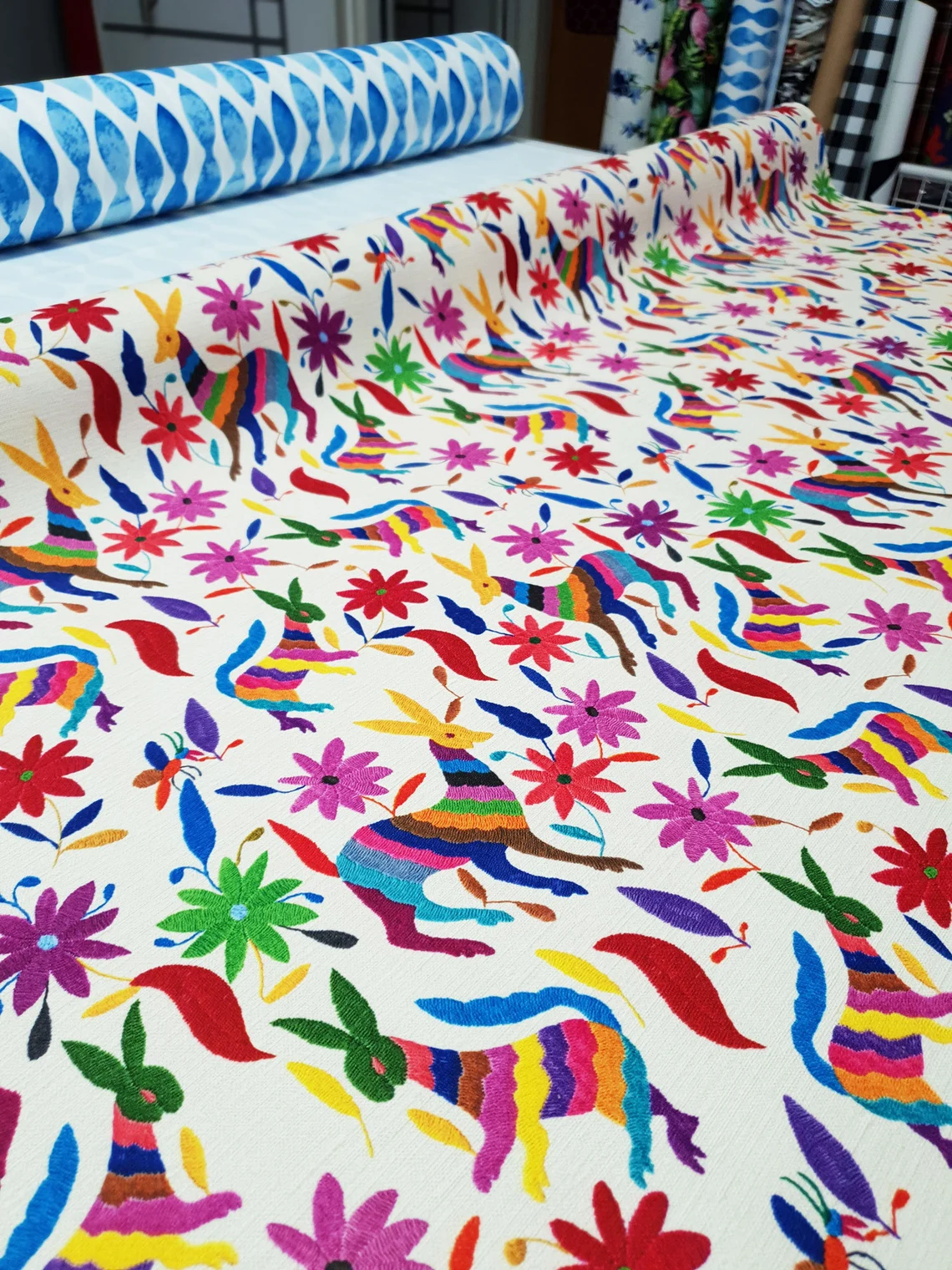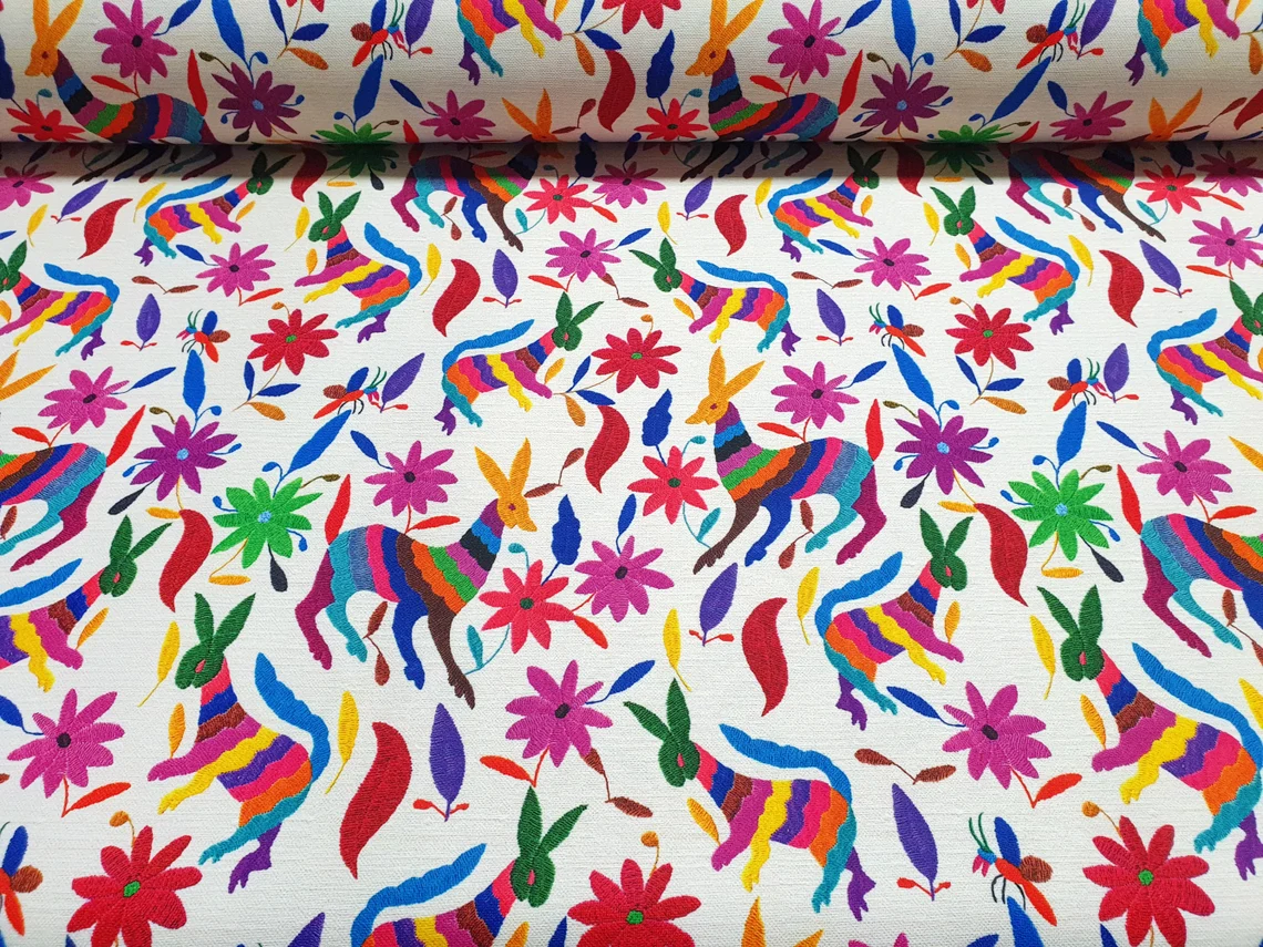 Tessuto messicano Otomi per tappezzeria al metro: fiori, cervi e conigli in stile folk art per arredamento e rivestimento di sedie