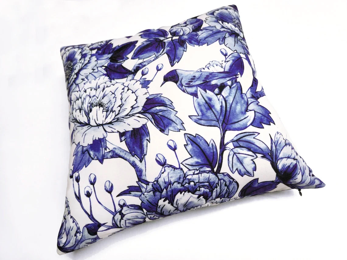 Blue Bird Flower Pillow Cover