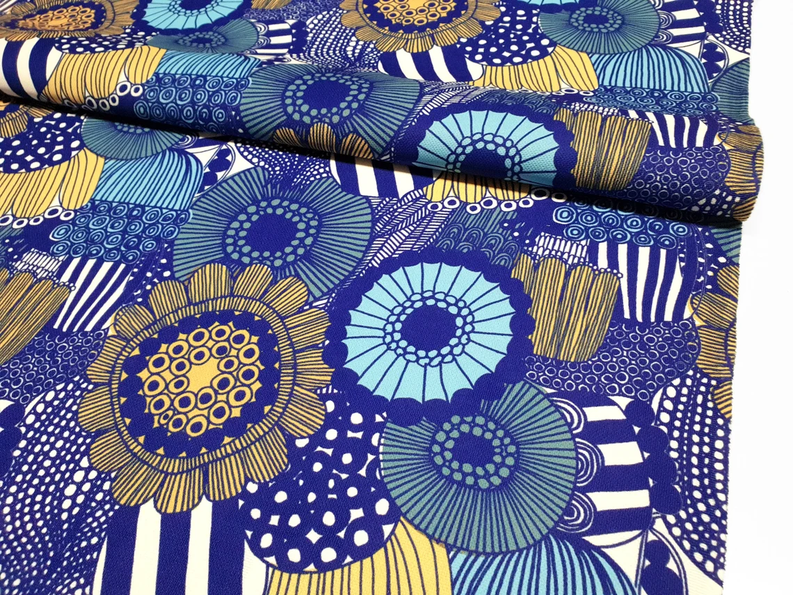 Blue Japanese Flowers Fabric by the Yard – Blue, Turquoise, Mustard Flowers on Blue – Home Decor, Drapery – Furniture Upholstery