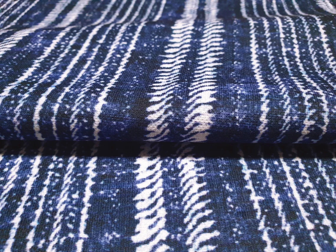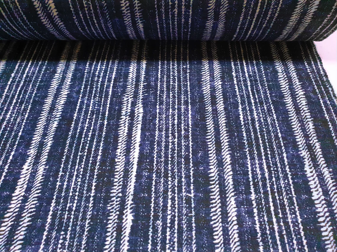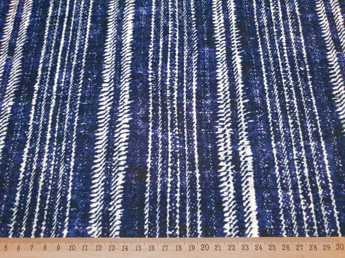 Indigo Batik Stripe Fabric – Boho Bohemian White Horizontal Tie Dyed Stripes on Navy Blue – Drapery, Upholstery Fabric by the Yard