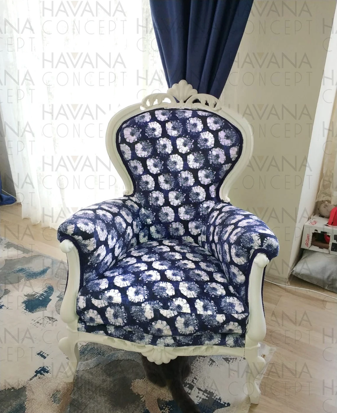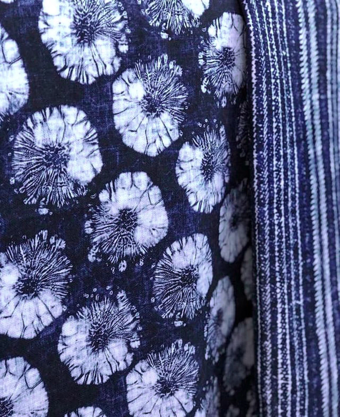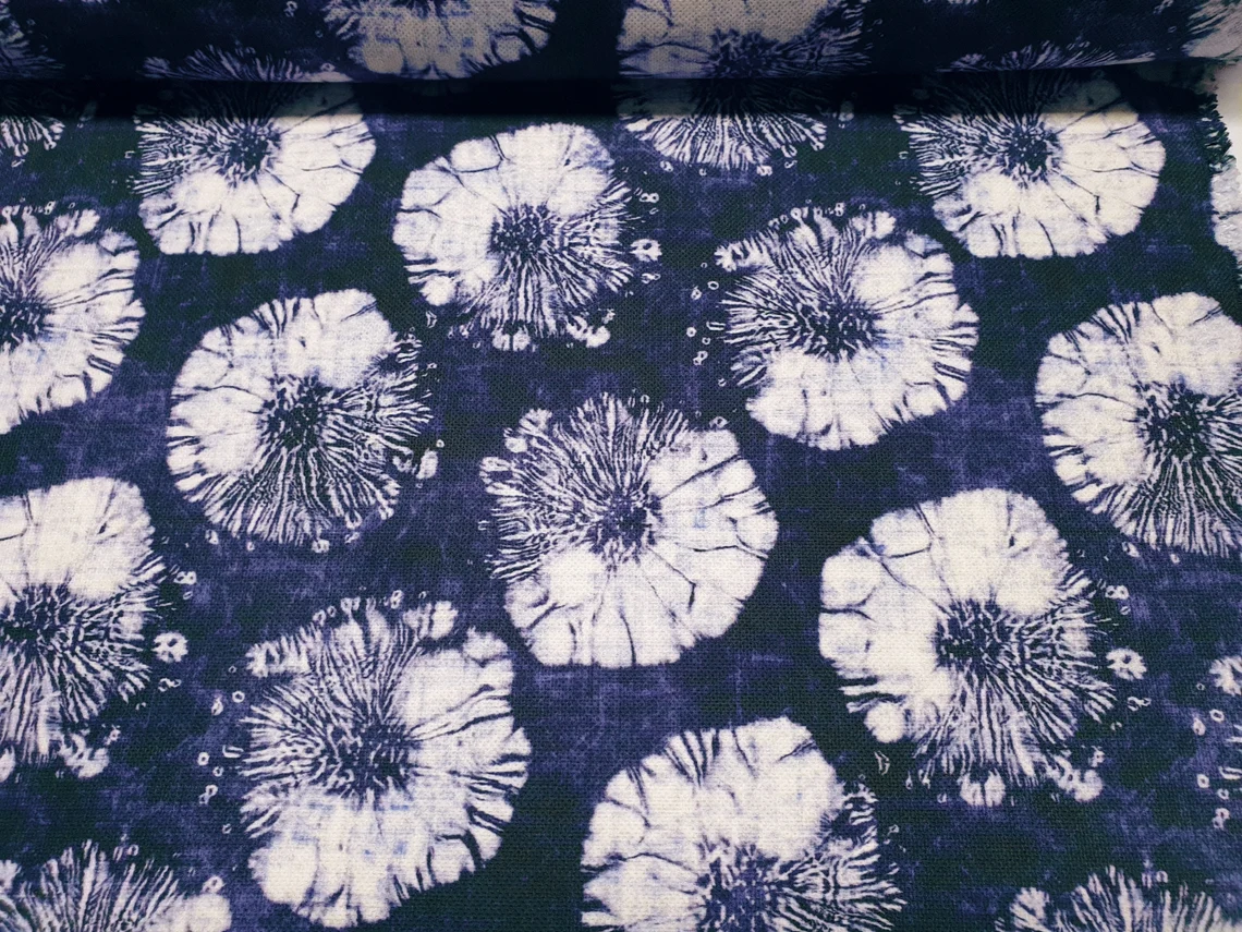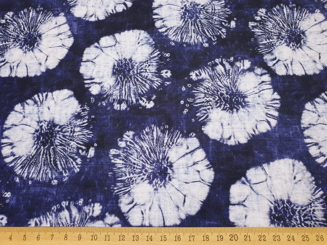 Indigo Round Batik Fabric by the Yard – Boho White Round Psychedelic Half Round on Blue – For Chair, Bench Upholstery, Home Decor Drapery