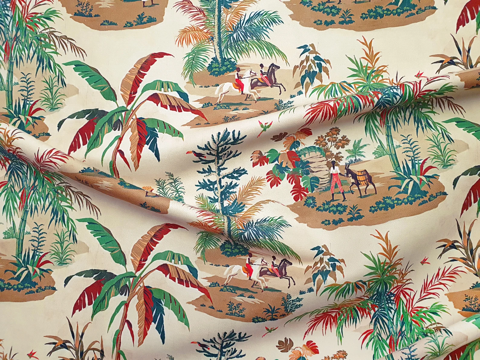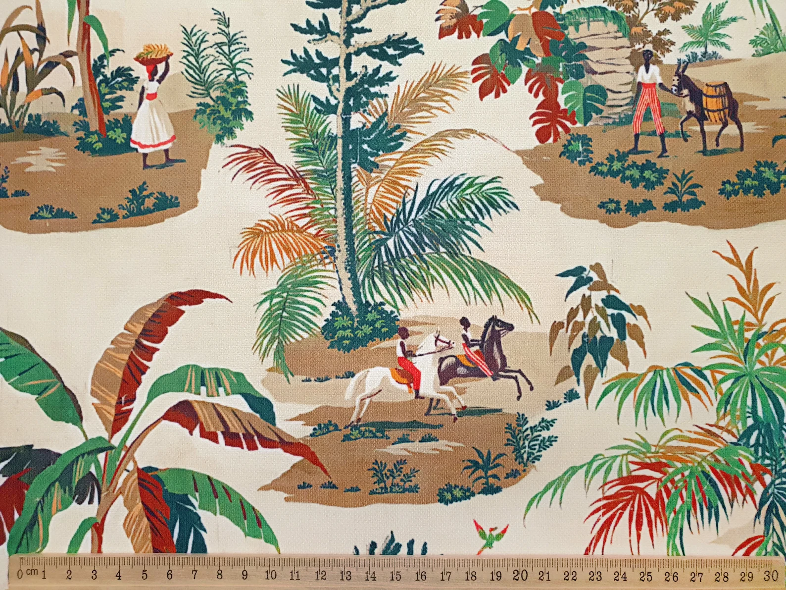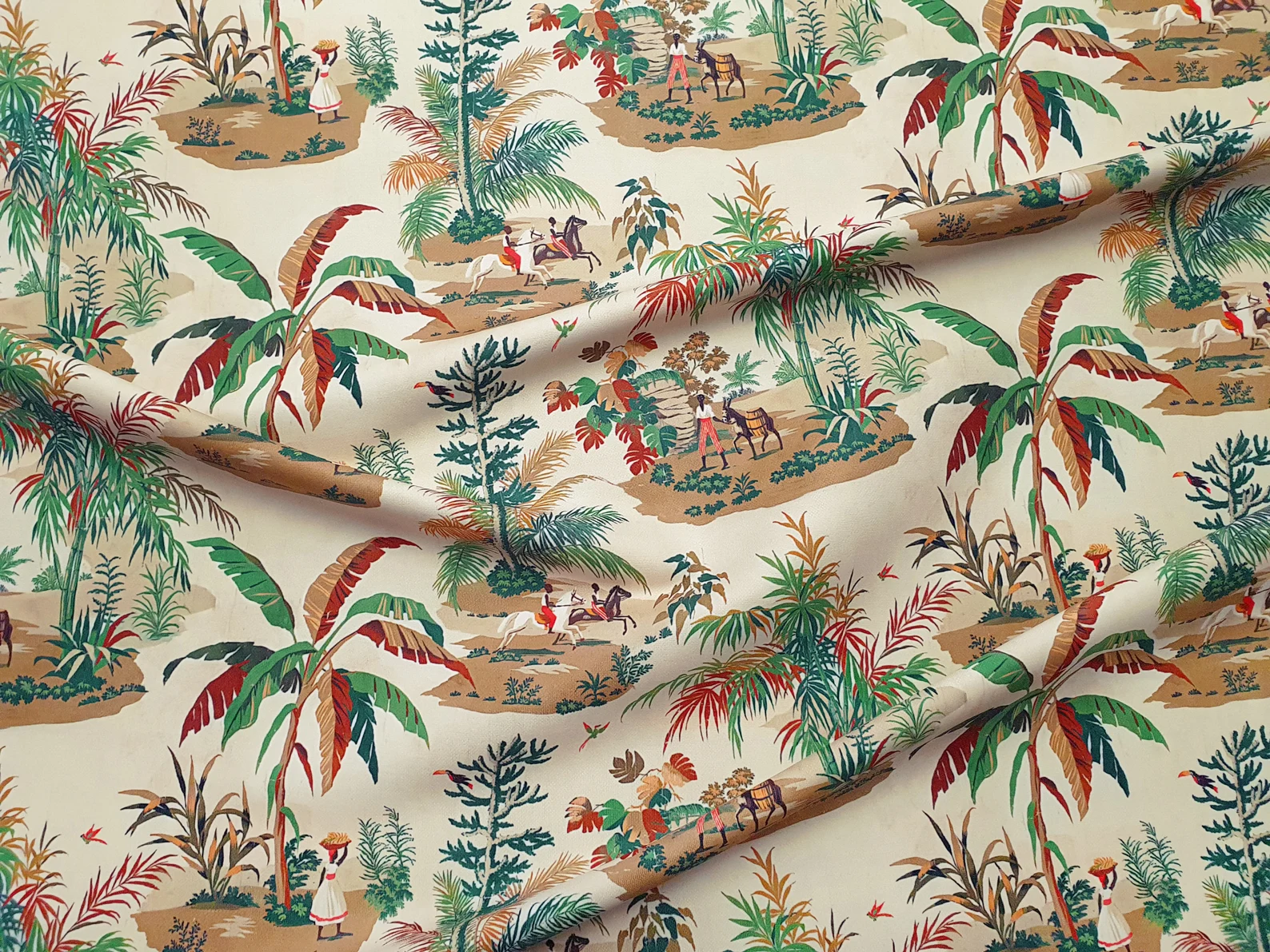 Martinique Island Toile Fabric by the Yard, French Pastoral Print Fabric, Farmers Under Banana Bamboo Trees Fabric for Upholstery Home Decor
