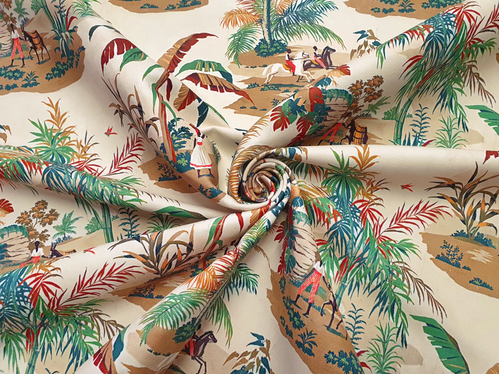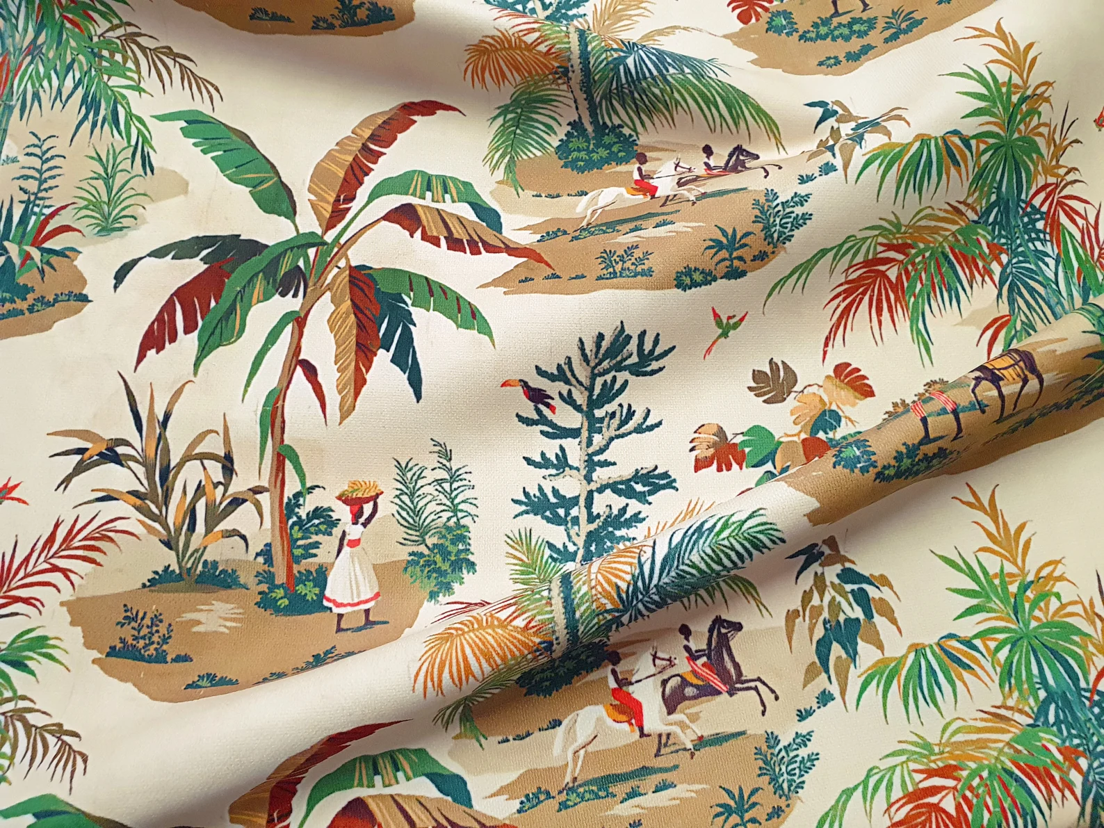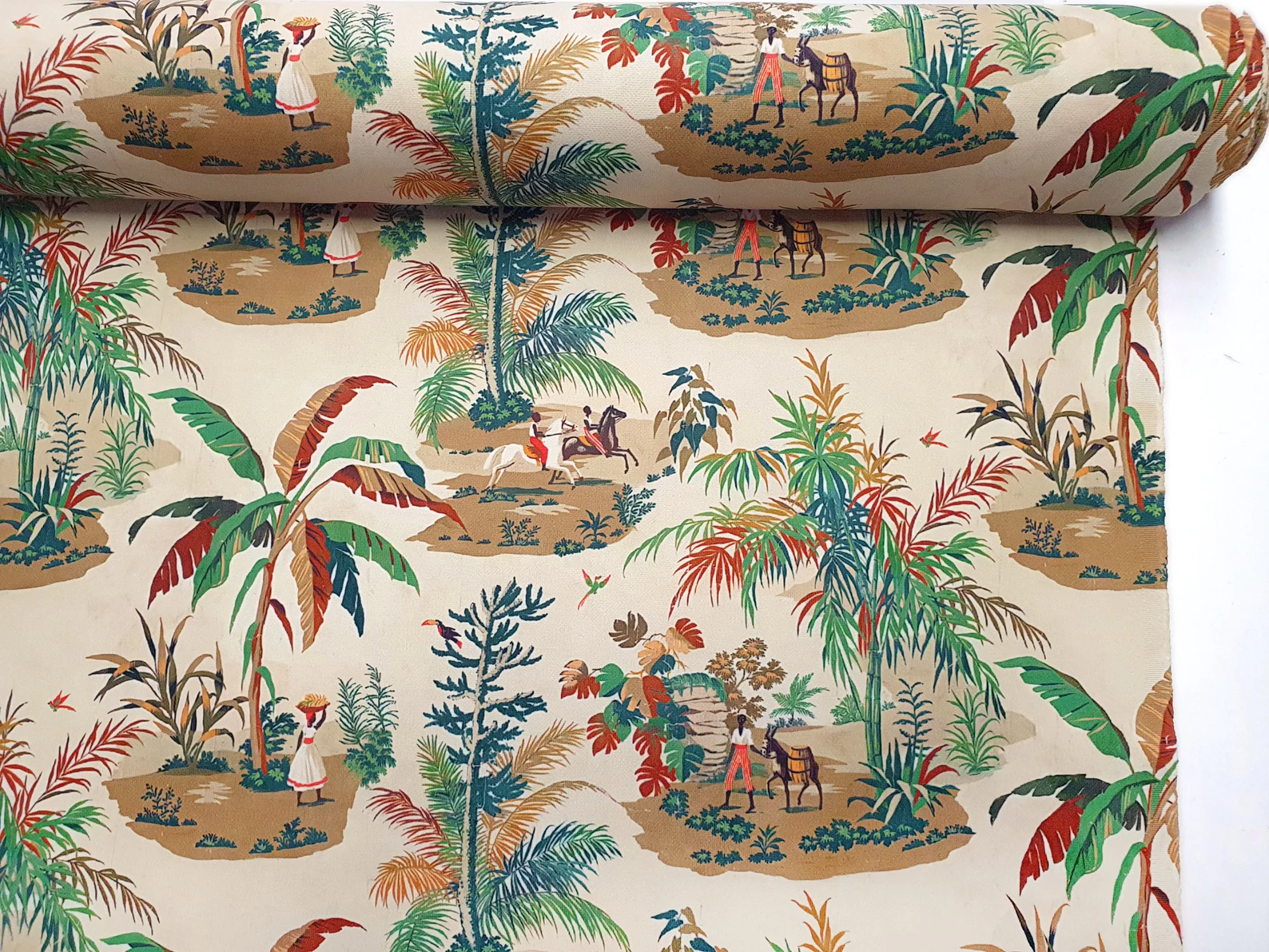 Martinique Island Toile Fabric by the Yard, French Pastoral Print Fabric, Farmers Under Banana Bamboo Trees Fabric for Upholstery Home Decor