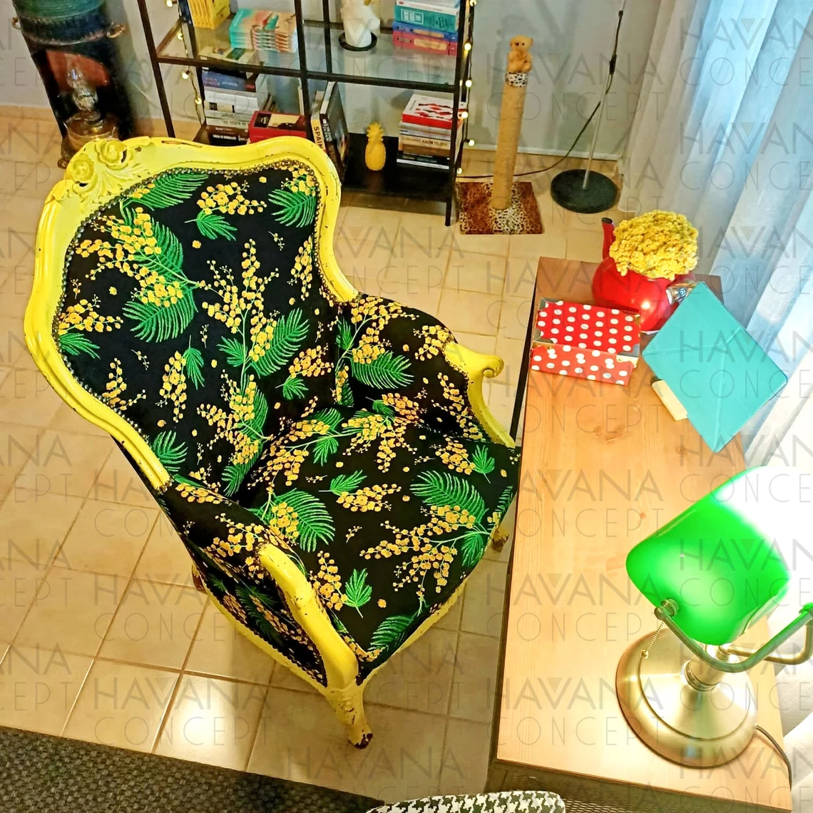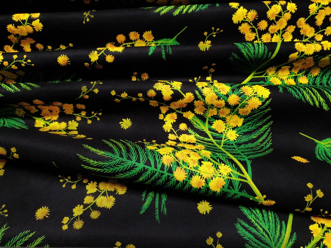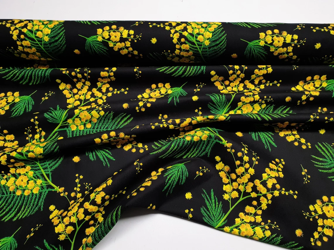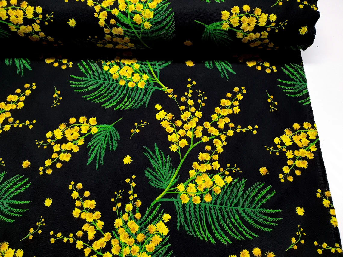 Mimosa Print Fabric by the Yard – Yellow Acacia Flowers on Black Print Fabric for Upholstery, Home Decor, Curtain, Tablecloth, Table Runner