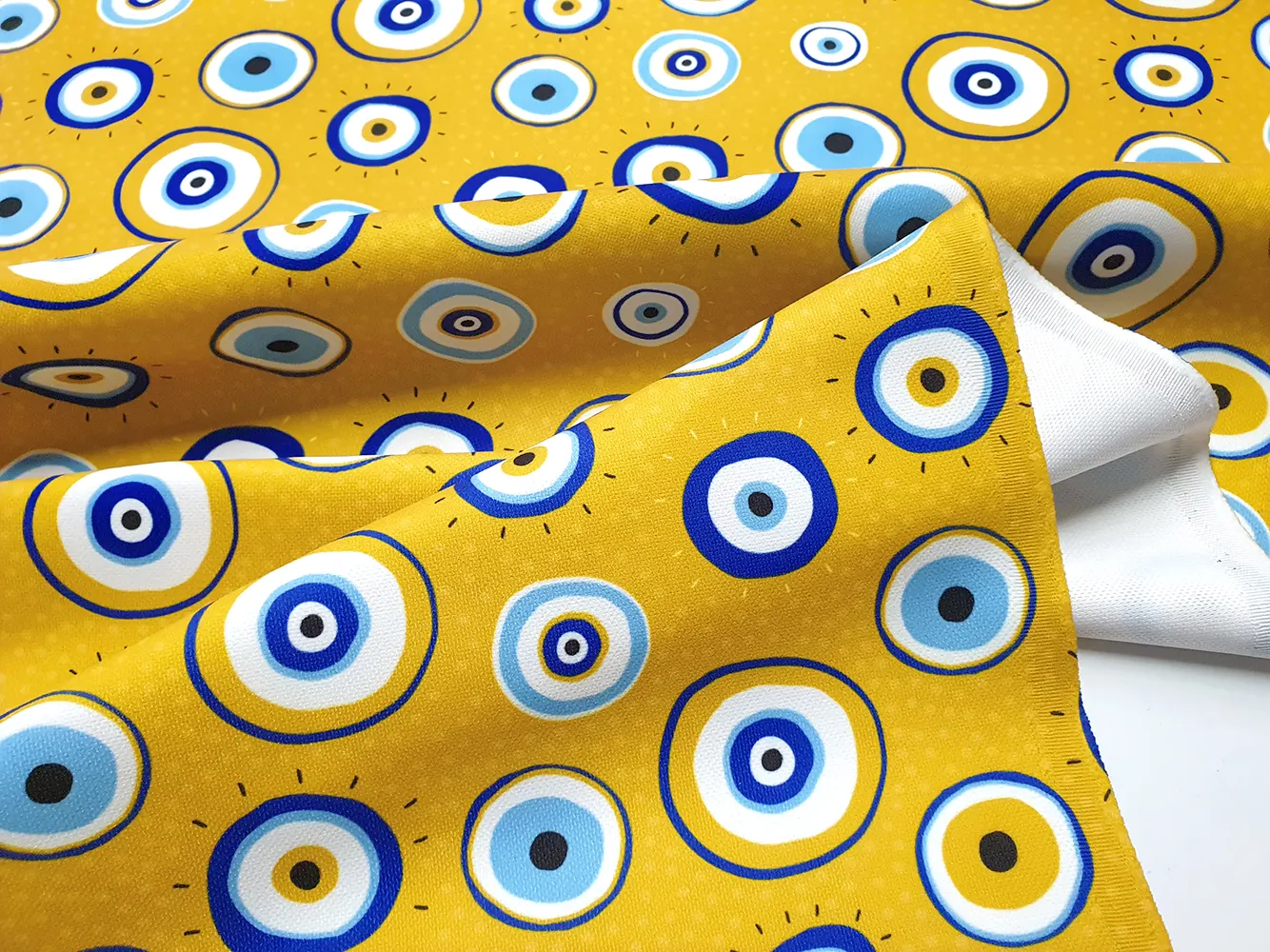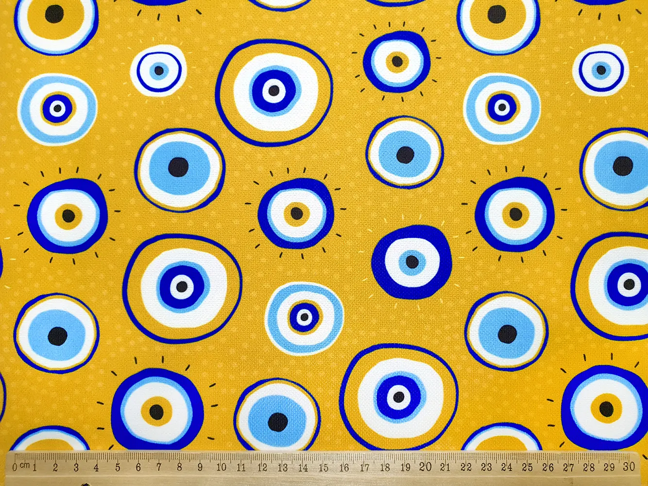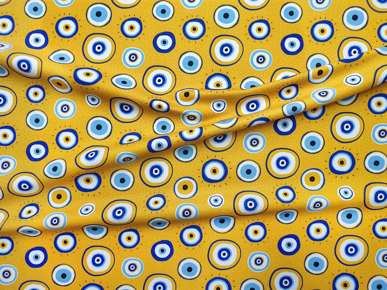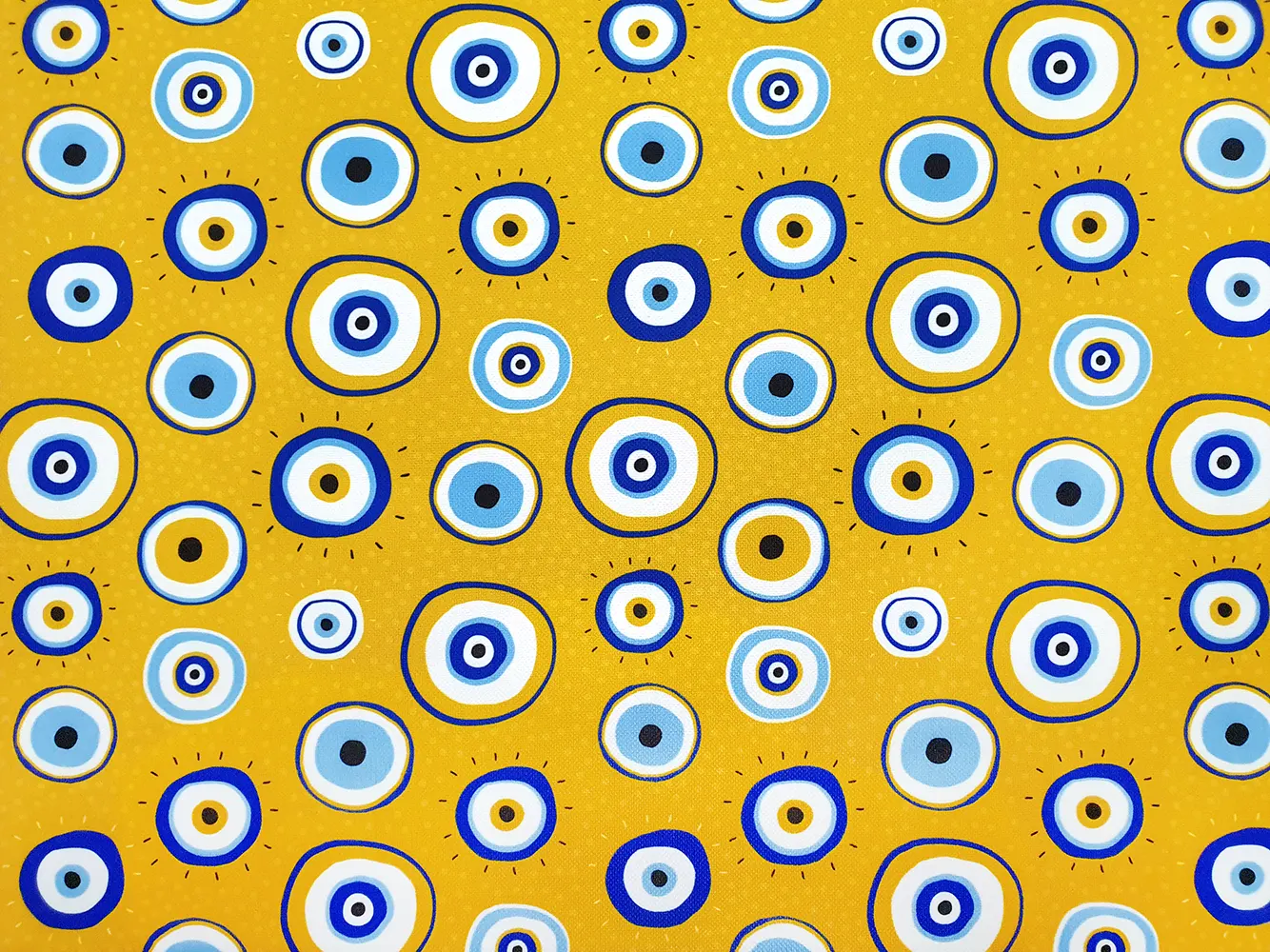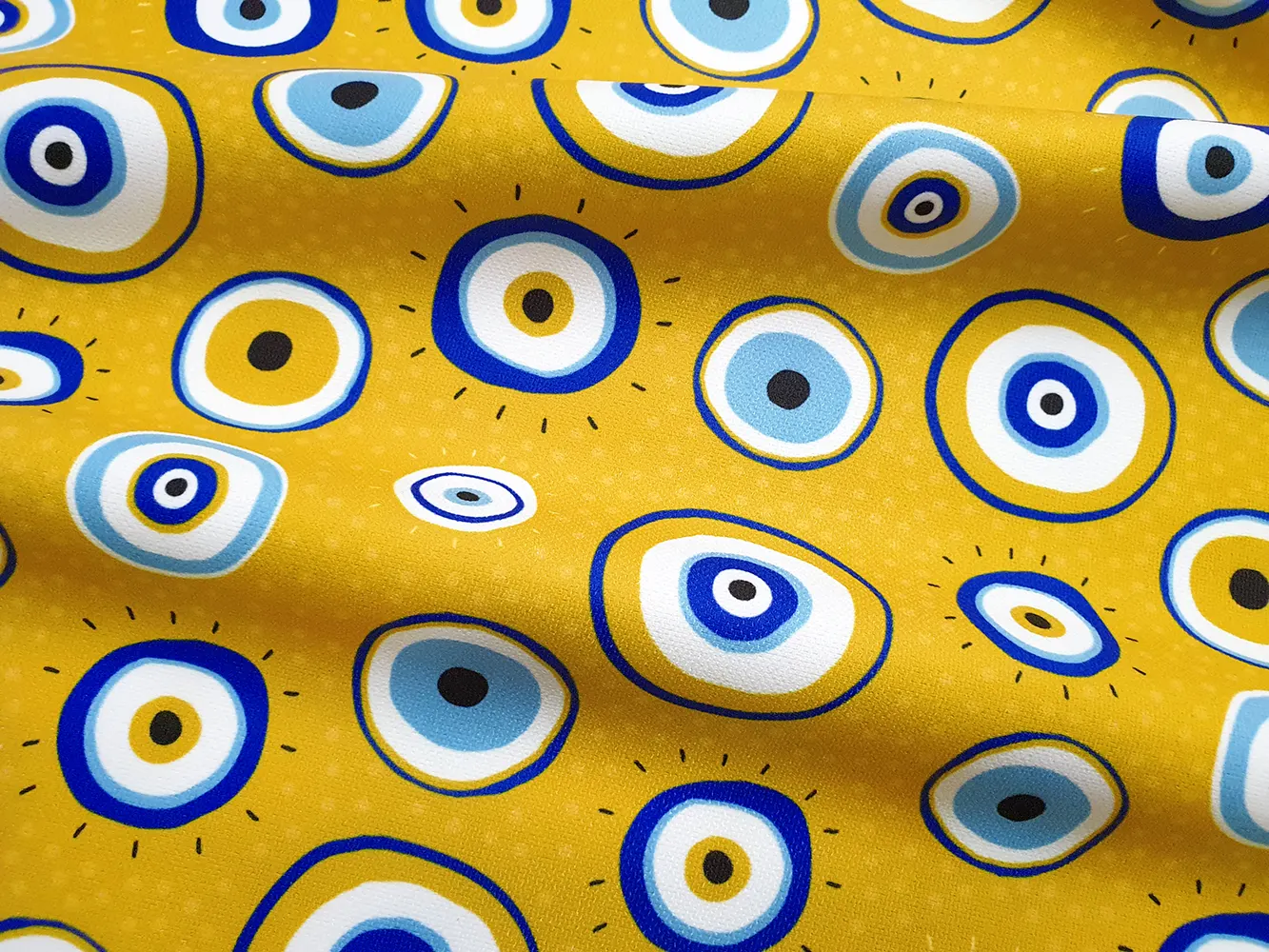 Mustard Evil Eye Bead Fabric – Mustard Blue Fabric by the Yard, Upholstery Fabric for Home Decor, Chair, Sofa, Drapery, Craft, Furniture, Amulet Eyes