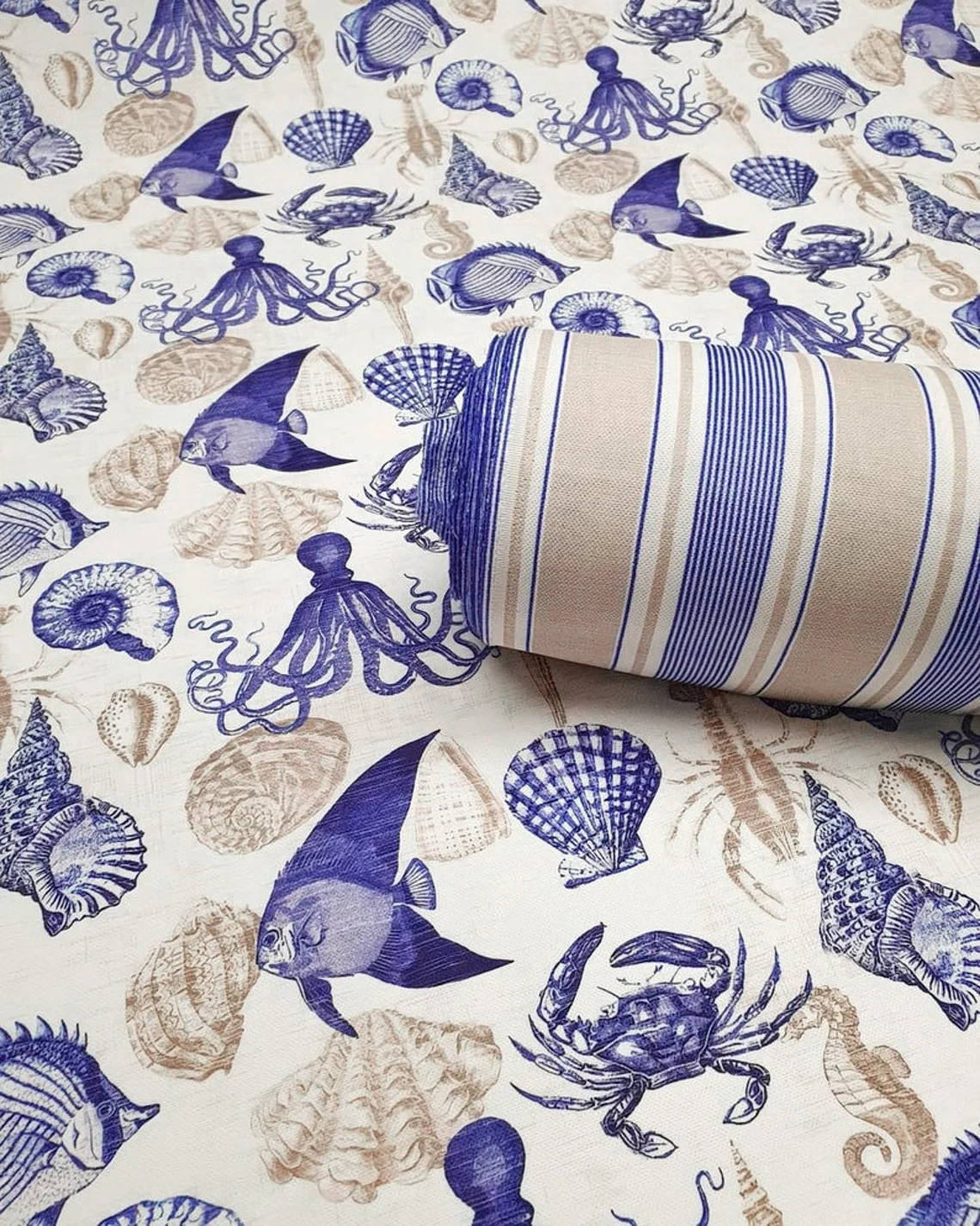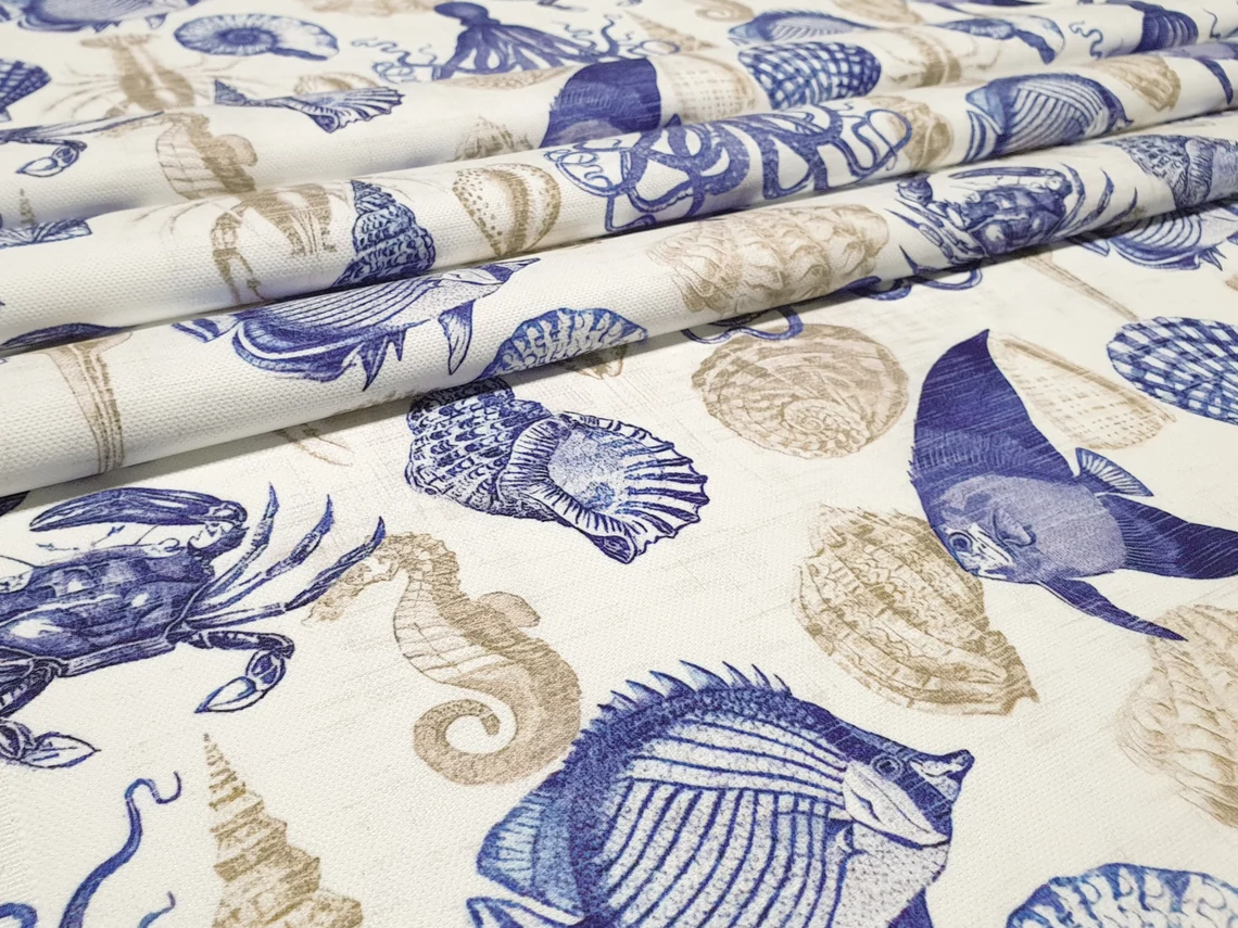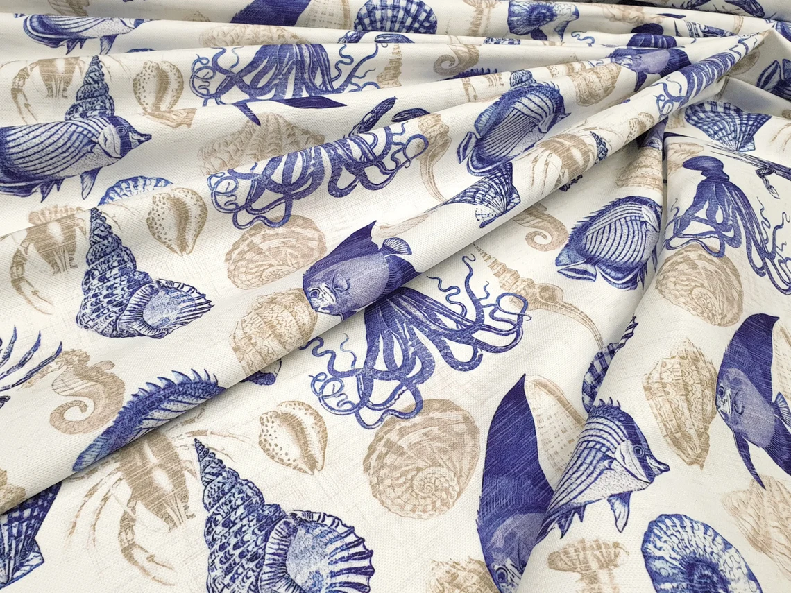Nautical Sea Life Marine Fabric by the Yard – Ocean Octopus, Fish, Shell and Crab Pattern Upholstery Drapery , Multi-purpose Fabric