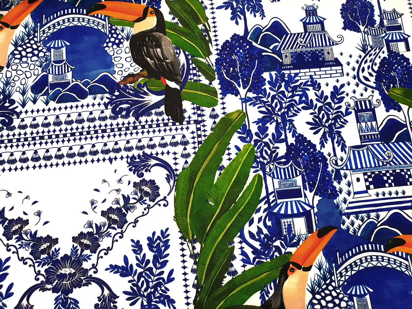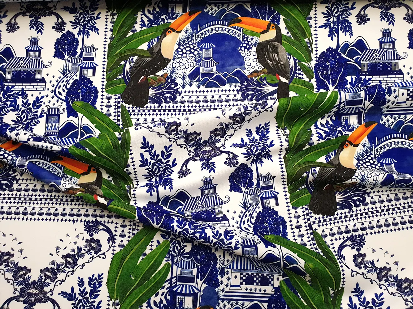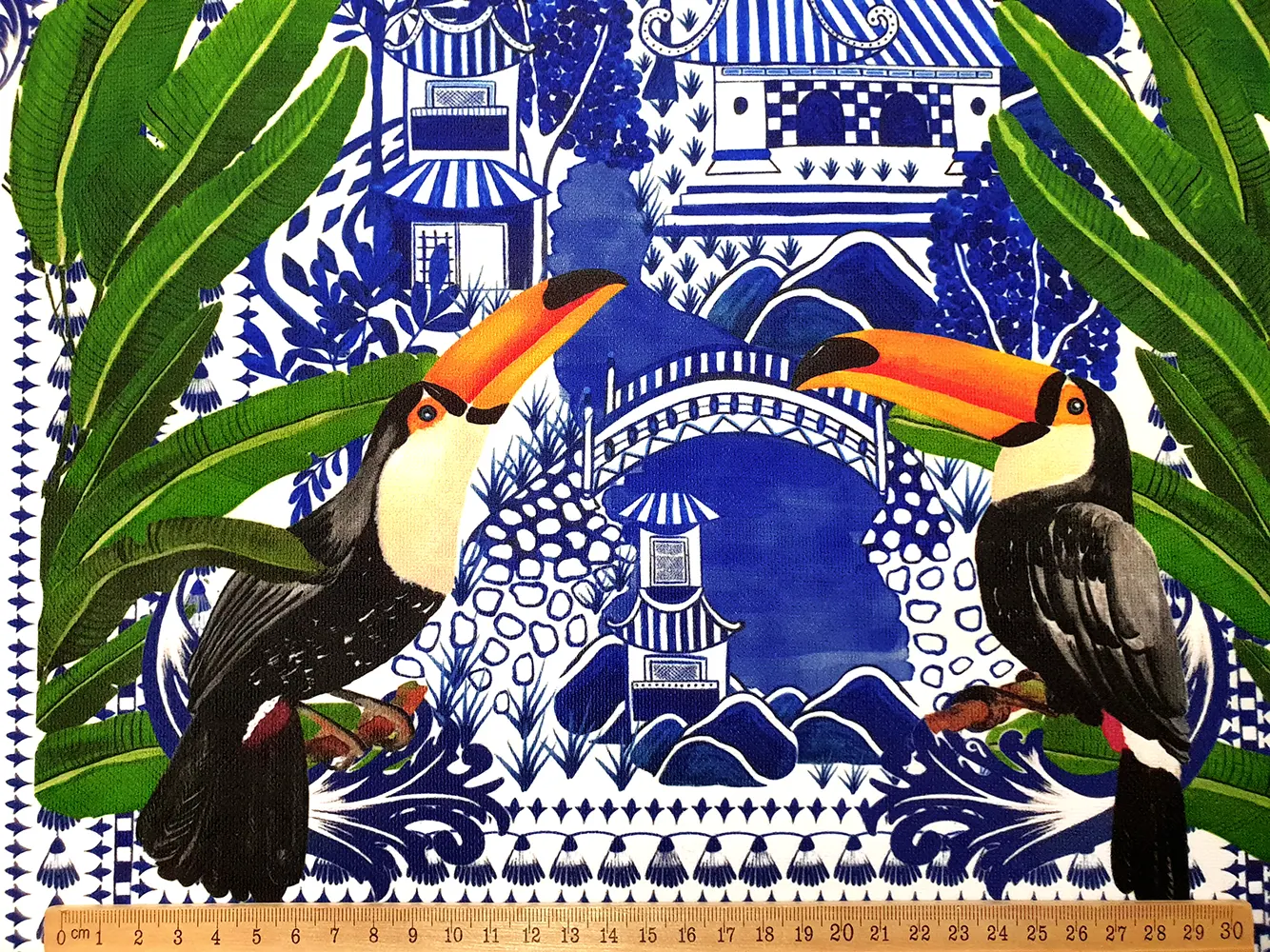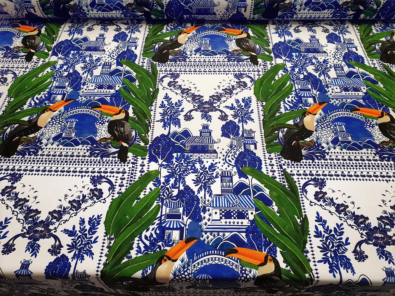 Toucan Birds and Azulejo Tiles Fabric – Upholstery Fabric, Portuguese Mosaic Tiles, Macau Farm and Toucan Birds Fabric for Drapery, Home Decor