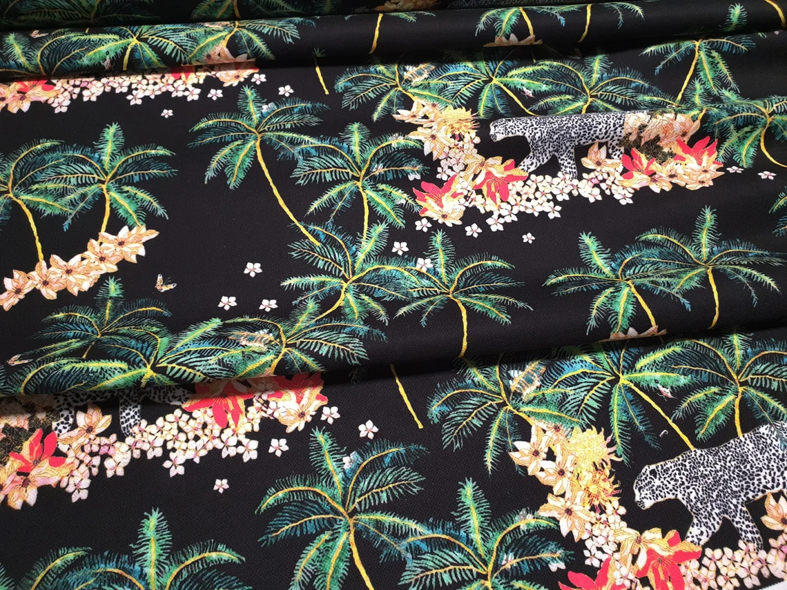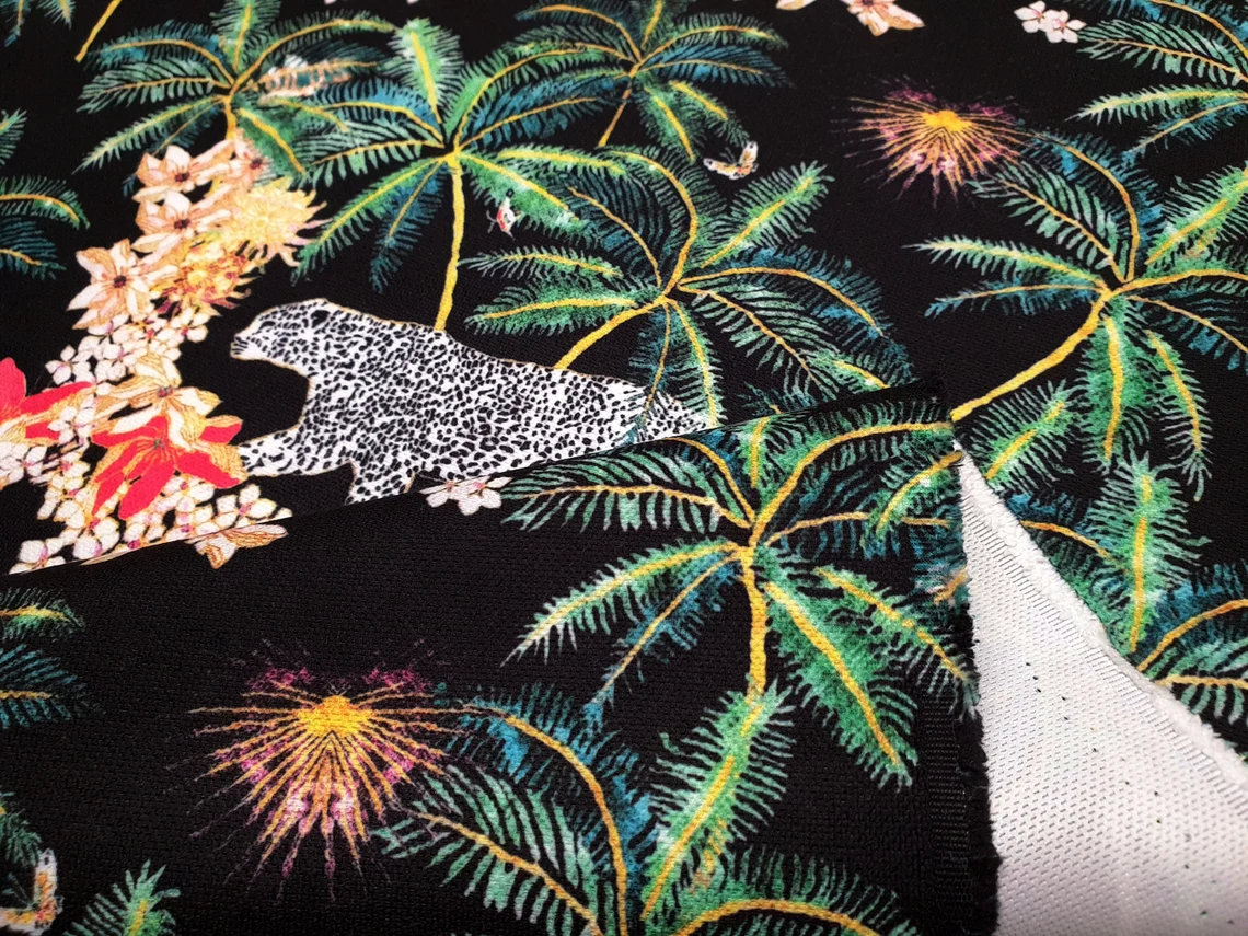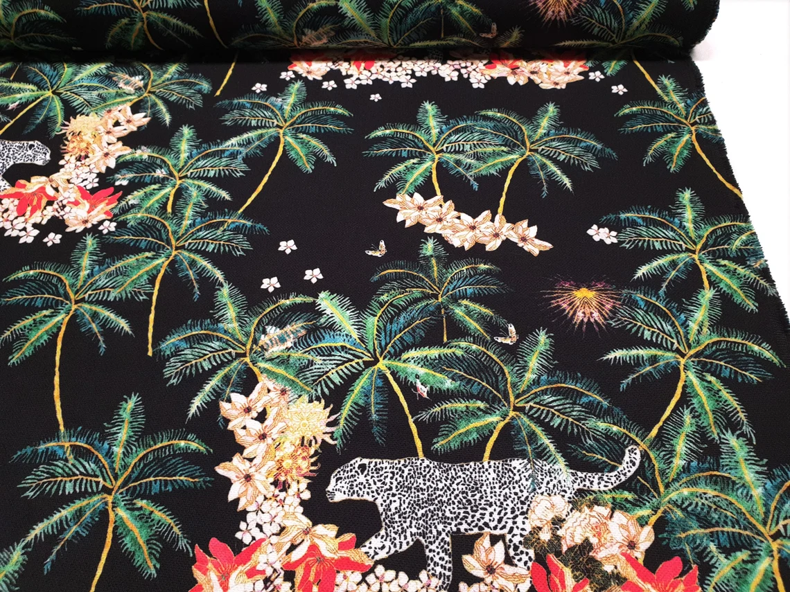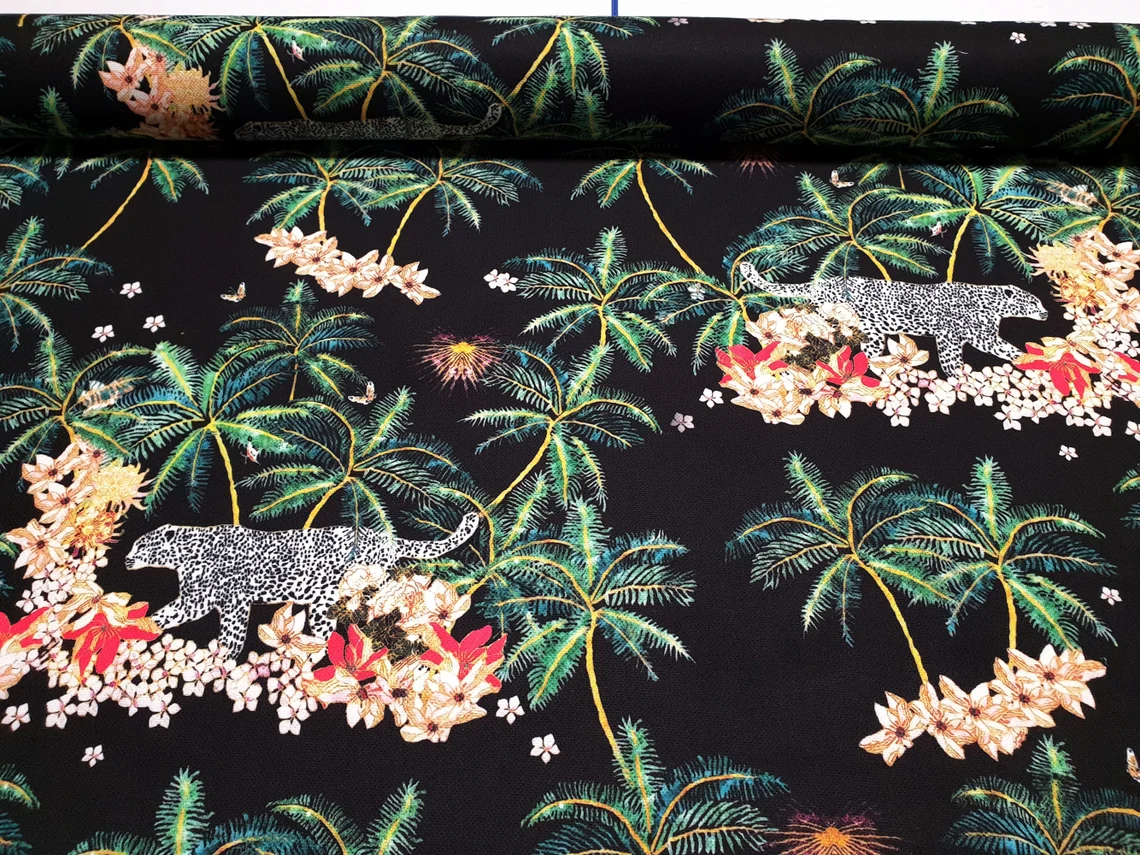 Tropical Trees and Leopard Fabric by the Yard – White Snow Leopard Animal Print, Palm Trees Flowers on Black – Home Decor, Drapery, Furniture Upholstery