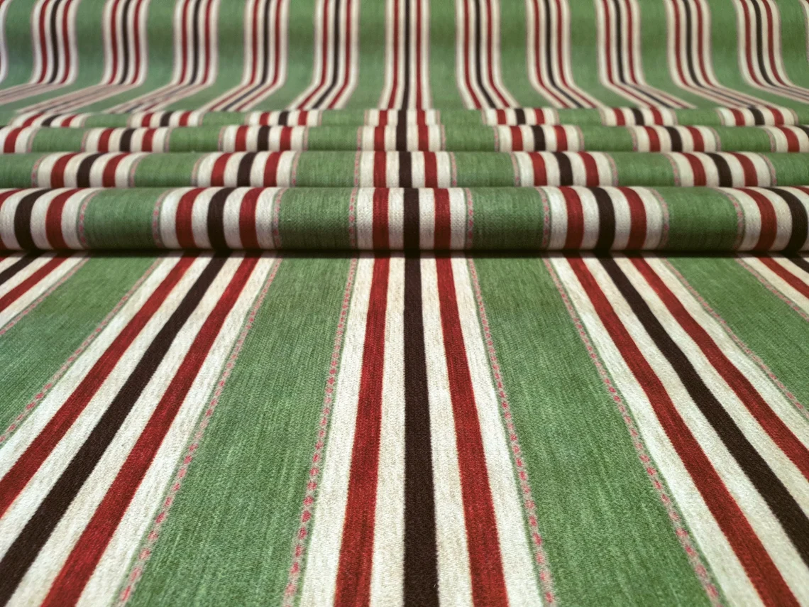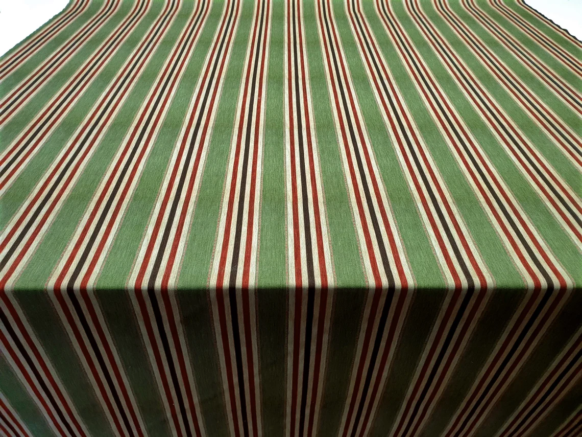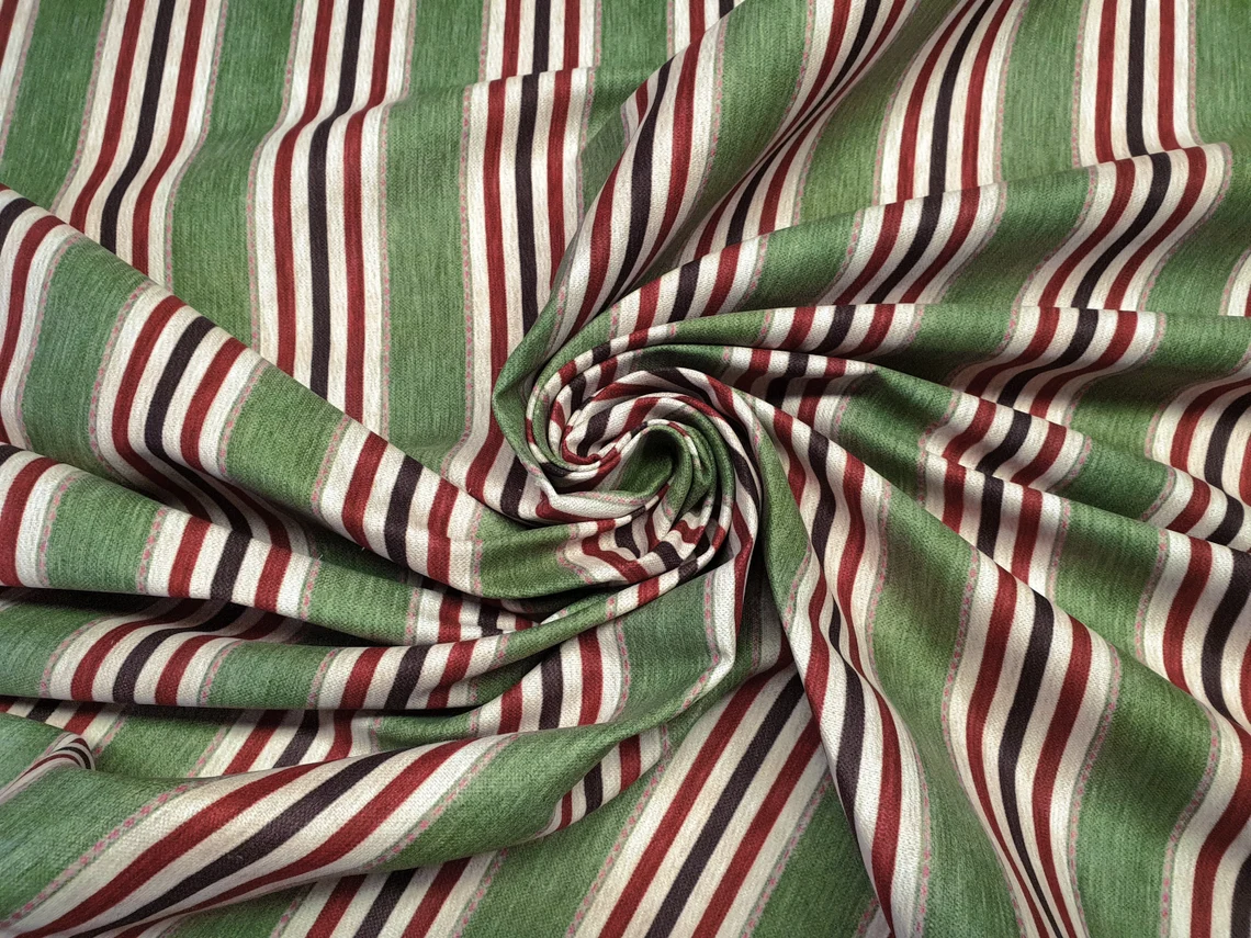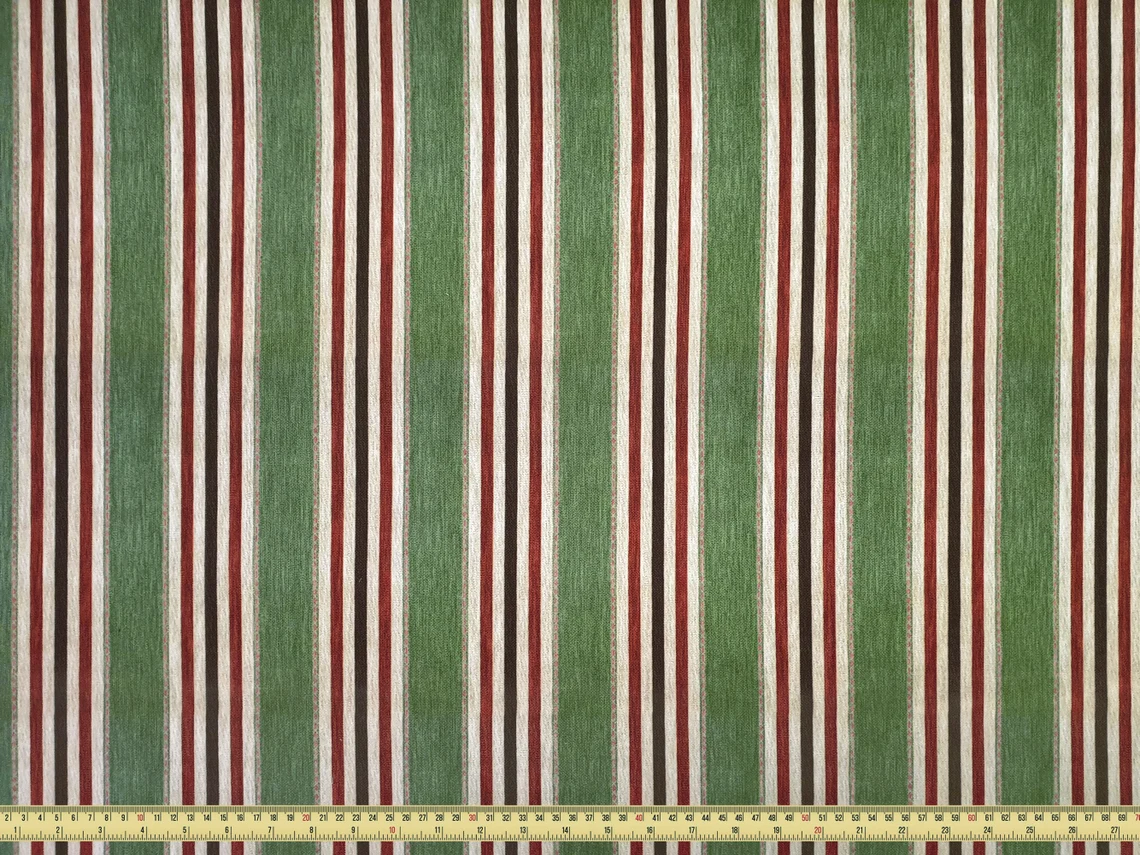 Vintage Striped Fabric by the Yard – Brown Maroon Creme Color Stripes on Green BG – For Curtain, Pillow, Chair, Sofa Upholstery